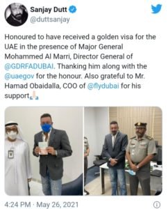 سنجے دت کو گولڈن ویزہ GDRFA-Dubai کے ڈائریکٹر جنرل ، میجر جنرل محمد احمد المری نے خود پیش کیا۔