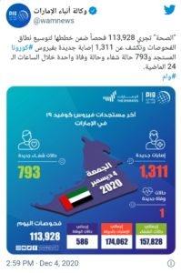 خلیج اردو: متحدہ عرب امارات کی وزارت صحت و روک تھام میں جمعہ کو 793 بازیافتوں کے ساتھ کوویڈ 19 کے 1،311 کیس رپورٹ ہوئے جبکہ ایک شخص کے جاں بحق ہونے کی بھی اطلاع ہے۔
