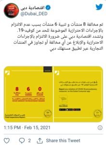 ایک ٹویٹ میں ، اتھارٹی نے دبئی کنزیومر ایپ کے ذریعے احتیاطی تدابیر پر عمل کرنے اور کسی بھی خلاف ورزی کی اطلاع دینے کی اہمیت پر زور دیا۔