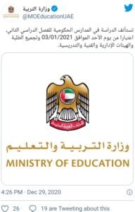 خلیج اردو: وزارت تعلیم نے اعلان کیا ہے کہ سرکاری اسکولوں کے لئے اگلا تعلیمی سال 3 جنوری 2021 سے تمام طلباء ، انتظامی عملہ اور تدریسی عملے کے لئے دوبارہ شروع ہوگا۔