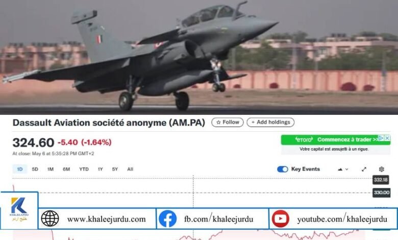 راولپنڈی: پاک فضائیہ کی جانب سے بھارتی فضائیہ کے رافیل طیارے کو مار گرانے کے بعد اس واقعے کے اثرات عالمی سطح پر بھی نمایاں ہو گئے۔ سیکیورٹی و دفاعی ذرائع کے مطابق رافیل طیارہ گرائے جانے کے بعد فرانس کی معروف دفاعی کمپنی ڈاسالٹ سسٹمز کے عالمی مارکیٹ میں شئیرز میں نمایاں کمی دیکھی گئی۔