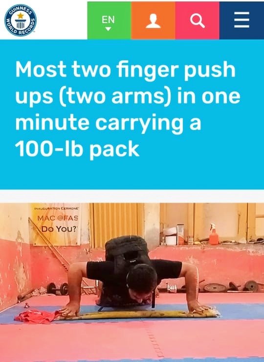 عرفان محسود نے دو انگلیوں پے 100پاونڈ وزن کے ساتھ 16 پش اپس کر کے 12 پش اپس کا اپنا ہی ورلڈ کا ریکارڈ توڑ دیا جو اس سال 14 اگست کو ریکارڈ اٹیمپٹ کیا گیا تھا۔