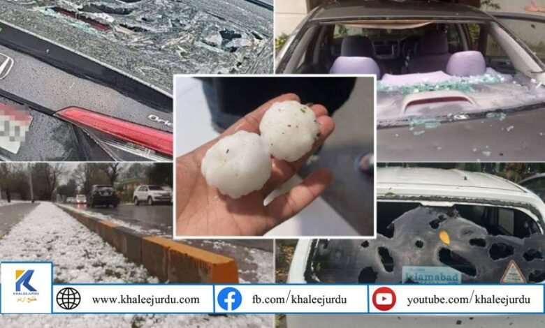 اسلام آباد: وفاقی دارالحکومت اسلام آباد اور راولپنڈی میں طوفانی بارش اور شدید ژالہ باری نے نظام زندگی درہم برہم کر دیا، بڑے سائز کے اولوں کے باعث گاڑیوں کے شیشے ٹوٹ گئے اور گاڑیوں پر ڈینٹ پڑ گئے۔ ژالہ باری کے بعد سڑکیں سفید ہو گئیں جبکہ موسم خوشگوار ہو گیا۔