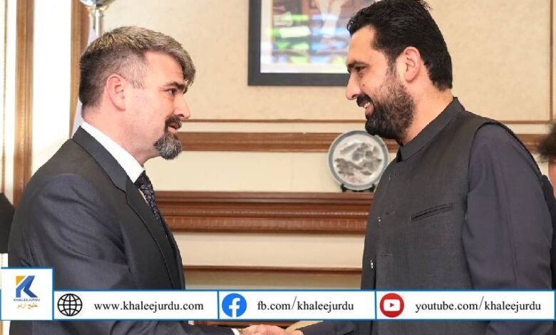 پشاور: وزیر اعلیٰ خیبر پختونخوا سہیل آفریدی سے امریکی قونصل جنرل تھامس ایکرٹ نے وزیر اعلی ہاؤس پشاور میں اہم ملاقات کی، جس میں تجارت، سرمایہ کاری، معدنیات، توانائی اور سکیورٹی تعاون سے متعلق تفصیلی گفتگو ہوئی۔ ملاقات میں امریکہ کی جانب سے انسدادِ دہشت گردی اور انسدادِ منشیات کے شعبوں میں معاونت پر بھی تبادلہ خیال کیا گیا۔