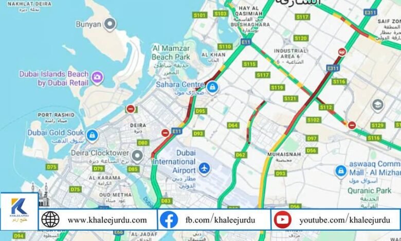 صبح کے وقت سب سے زیادہ دباؤ شارجہ سے دبئی آنے والے راستوں پر دیکھا گیا، جہاں گوگل میپس کے مطابق مصروف شاہراہوں پر طویل ٹریفک جام کی صورتحال رہی۔ الرٹ ڈیٹا کے مطابق متعدد حادثات نے رش میں مزید اضافہ کیا، جن میں التعاون اسٹریٹ اور S113 الخالدیہ ڈسٹرکٹ کے واقعات شامل ہیں۔ دبئی میں بھی القصیص کی 10ویں اسٹریٹ پر ایک علیحدہ حادثہ رپورٹ ہوا۔