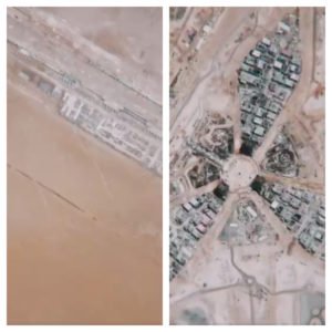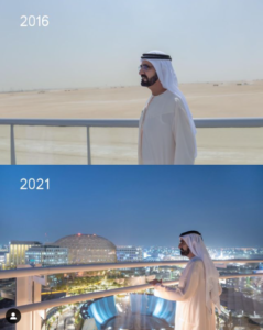 پہلی تصویر میں دیکھا جاتا ہے کہ شیخ محمد جہاں کھڑے ہیں وہاں کچھ بھی نہیں اور صحرا ہے جبکہ دوسری تصویر میں یہاں دنیا کے سب سے بڑے شو کیلئے سجایا گیا سیٹ اور دنیا کا سب سے بہترین نظارہ ہے۔