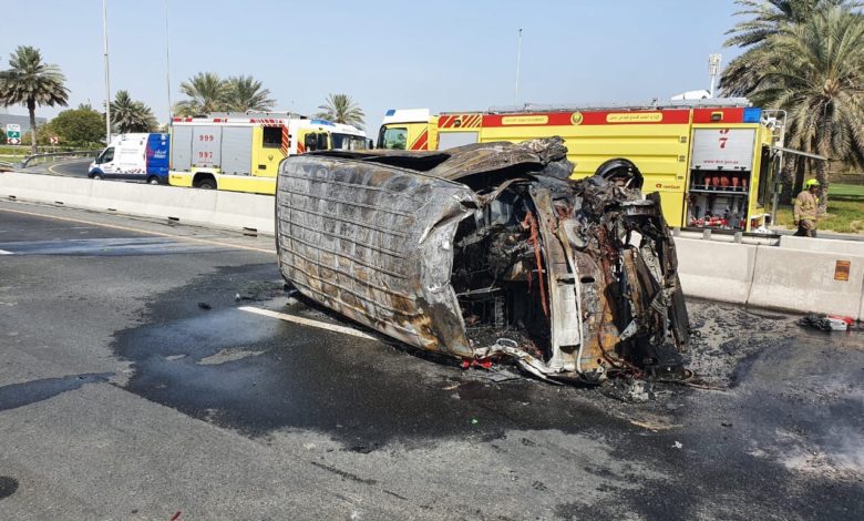 خلیج اردو آن لائن: پولیس کے مطابق یہ حادثہ اس وقت پیش آیا جب ایک 14 مسافروں کو لے جانی والی منی بس سڑک سے اتر گئی اور سڑک کے دائیں جانب بنی سیمنٹ کی رکاوٹ سے جا ٹکرائی جس کے بعد گاڑی میں آگ بھڑک اٹھی۔ جس کے نتیجے میں 12 افراد زخمی اور دو ہلاک ہوگئے۔