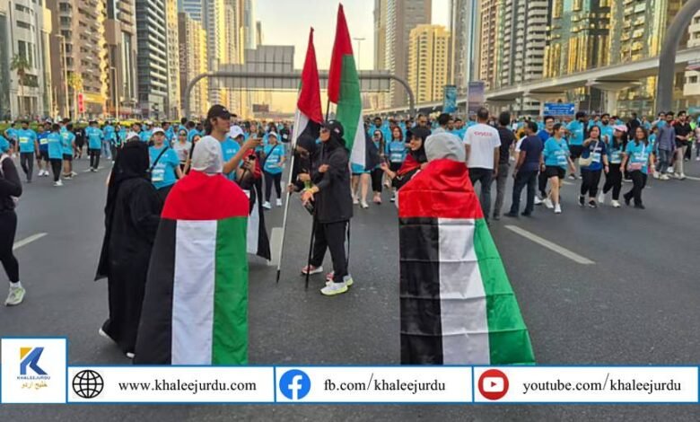 دوڑ کے دوران فضاء میں ایک شاندار منظر اس وقت دیکھنے میں آیا جب پیراشوٹ بردار ماہرین امارات کا قومی پرچم تھامے نیچے اترے۔ اسی دوران رنرز خوشگوار موڈ میں ایک دوسرے کے ساتھ دوڑتے نظر آئے، جن میں سے کئی یو اے ای کے پرچم اور مختلف فضا پیدا کرنے والی اشیاء لیے ہوئے تھے۔