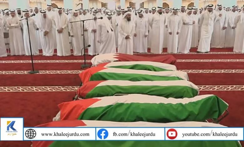 نماز جنازہ میں سیکڑوں افراد نے شرکت کی، جن میں روایتی سفید لباس اور فوجی وردیوں میں ملبوس افراد شامل تھے۔ شہدا میں پانچ فلسطینیوں کی میتوں کو فلسطینی پرچم میں لپیٹا گیا جبکہ قطری لانس کارپورل بدر سعد محمد الحمیدی الدوسری کو قطری پرچم میں سپرد خاک کیا گیا۔