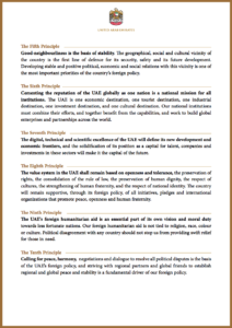 1. سب سے اولین ذمہ داری اور ترجیح یہی رہے گی کہ متحدہ عرب امارات کا اتحاد برقرار رہے۔ اس کے اداروں ، قانون اور آئین ، صلاحیتوں اور بجٹ کو مزید مضبوط کیا جائے۔ ملک کی شہرہ اور معاشی ترقی کو تیز تر کرنے سے ہی اتحاد قائم رہنے کے ساتھ ساتھ مضبوط اور پائیدار رہے گا۔