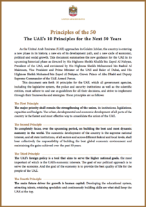 پچاس سالوں کیلئے اصول کے نام سے شائع شدہ دستاویزات کو متحدہ عرب امارات کے نائب صدر اور وزیر اعظم اور دبئی کے حکمران شیخ محمد بن راشد المکتوم اور ابوظبہی کے ولی عہد شہزادہ اور مسلح افواج کے ڈپٹی سپریم کمانڈر شیخ محمد بن زید المکتوم نے مشترکہ طور پر جاری کیا ہے۔