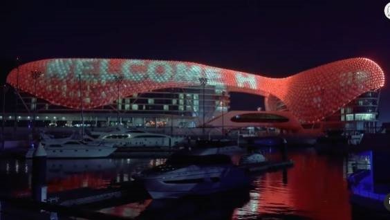جن بلڈنگوں پر سرخ بلبوؓ سے خوش آمدید لکھا گیا ہے ان میں ابوظبہی گلوبل مارکیٹ ، ڈی ڈبلیو ایٹ یاس آئی لینڈ ہوتل اور اتحاد ایرینا شامل ہیں۔