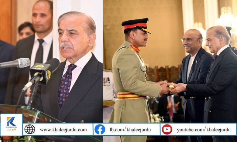 تقریب سے خطاب کرتے ہوئے وزیراعظم شہباز شریف نے کہا کہ ’’آج ایک تاریخی اور قابل فخر دن ہے۔ ہم اپنے ہیروز کی خدمات کے معترف ہیں۔‘‘ وزیراعظم نے فیلڈ مارشل عاصم منیر کو وطن کے تحفظ کے لیے ادا کیے گئے کردار پر خراج تحسین پیش کیا۔